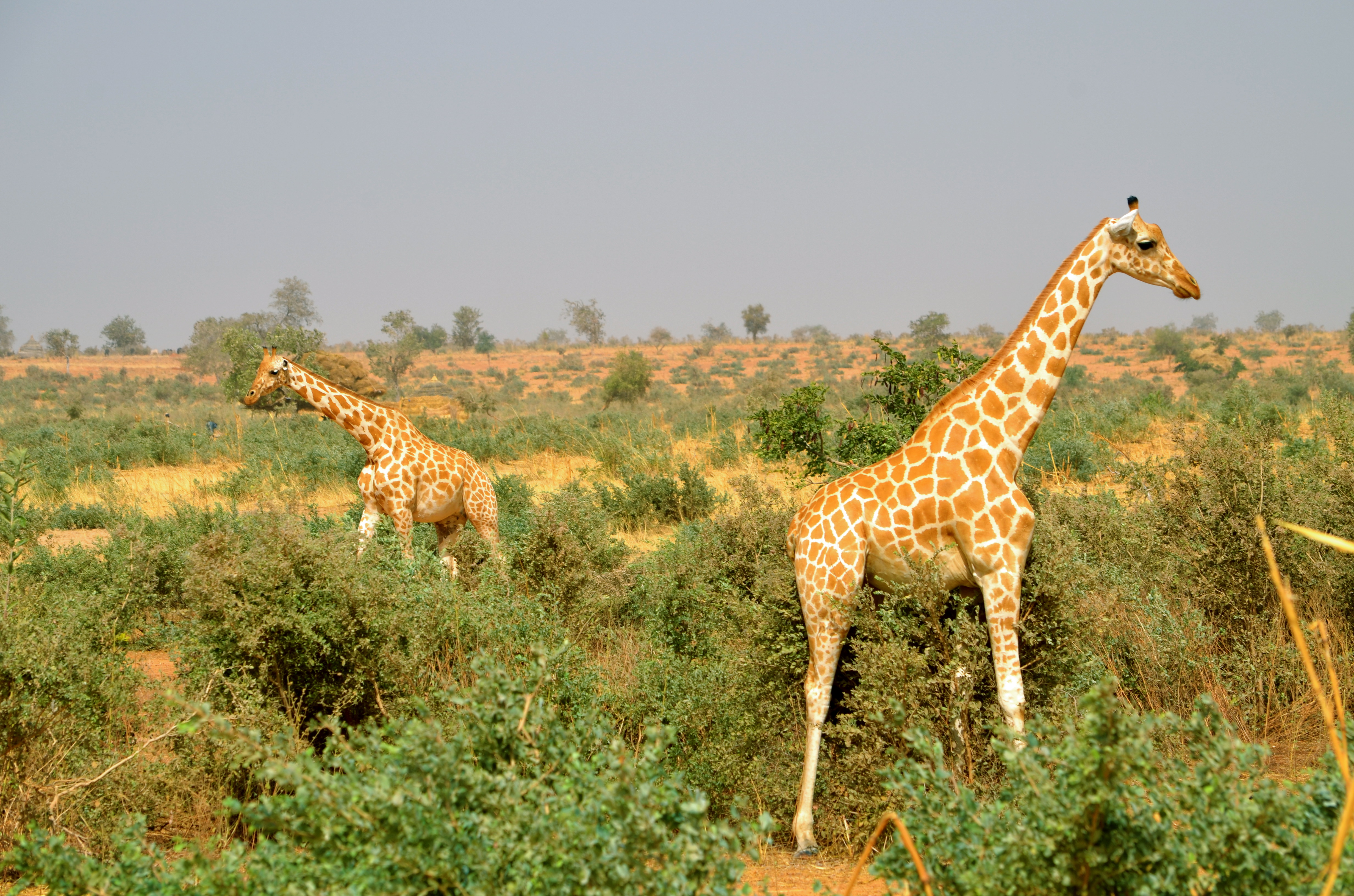 The famous Kouré giraffes. The one on the right is scratching his belly on a bush.