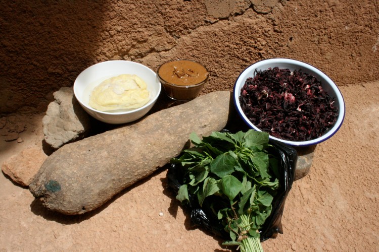 From left to right: shea butter in water, peanut paste, igname, bissap, oseille leaves