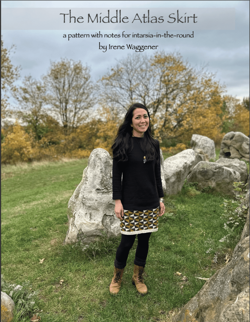 And so, the Middle Atlas Skirt pattern with notes for intarsia-in-the-round was born. Unlike most conventional knitting patterns that require you to get gauge and tell you exactly how many stitches to cast on, increase, etc., this pattern only requires one gauge swatch (using whatever needles and yarn you have on hand) and your waist and hip measurements. A table walks you step-by-step through the calculations necessary to produce a skirt that will fit your body shape. Once those numbers are determined, they are added to the pattern, which has blanks for your specific numbers. While some might groan at the thought of doing math, I have tried my best to walk you through it with clear and simple directions and formatting. The amount of time it takes to knit your swatch, measure your body, and figure out your numbers takes as much time as knitting gauge swatches for a conventional pattern – possibly less if you are like me and waste hours, if not days, trying to get gauge with dozens of little squares of knitting. The beauty of this style of knitting is that you can use any size needles and yarn (although it works best with yarns in the DK and worsted weights). Moreover, since the intarsia-in-the-round motif does not use much of any one color, it is great for yarn stash busting.