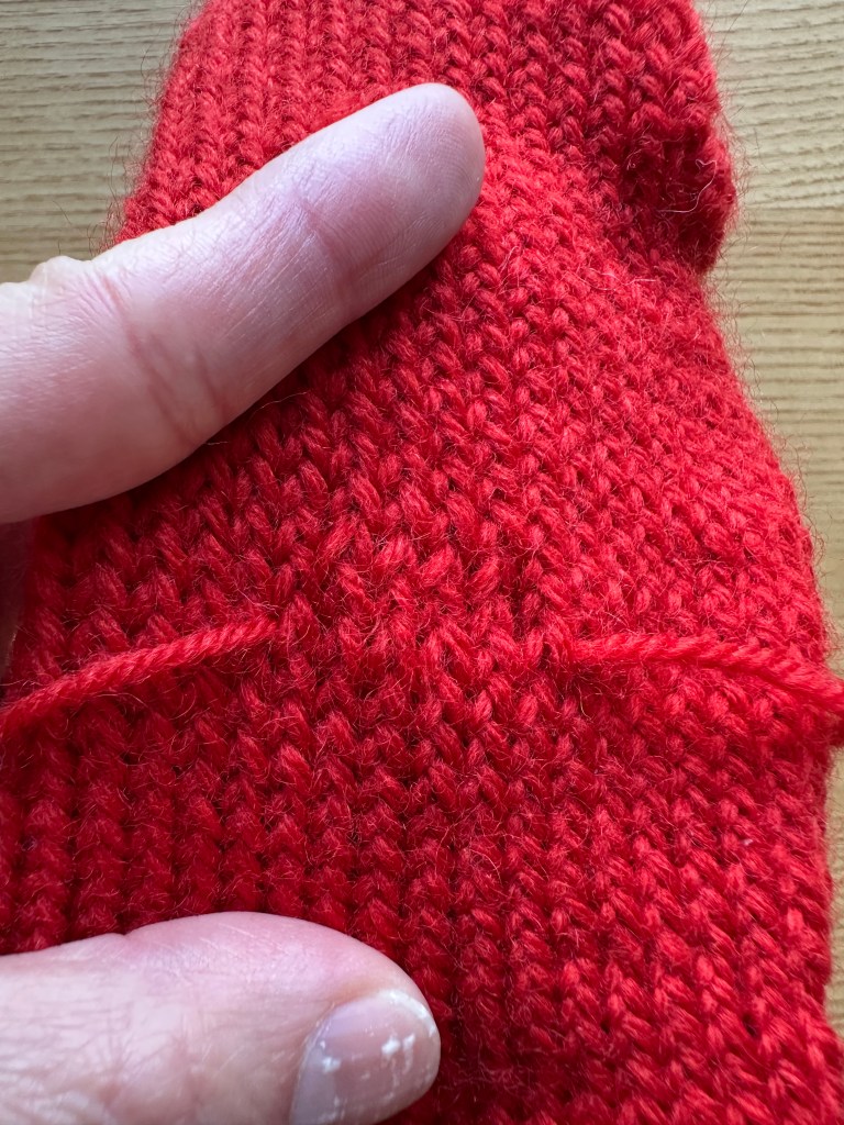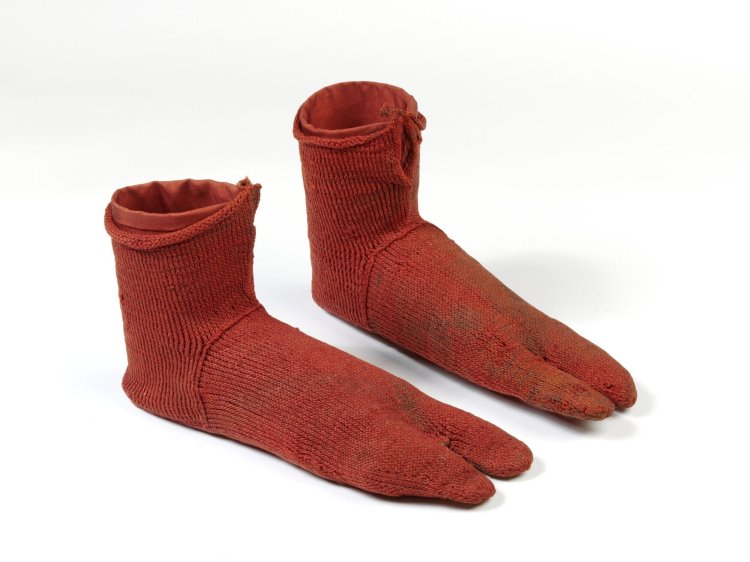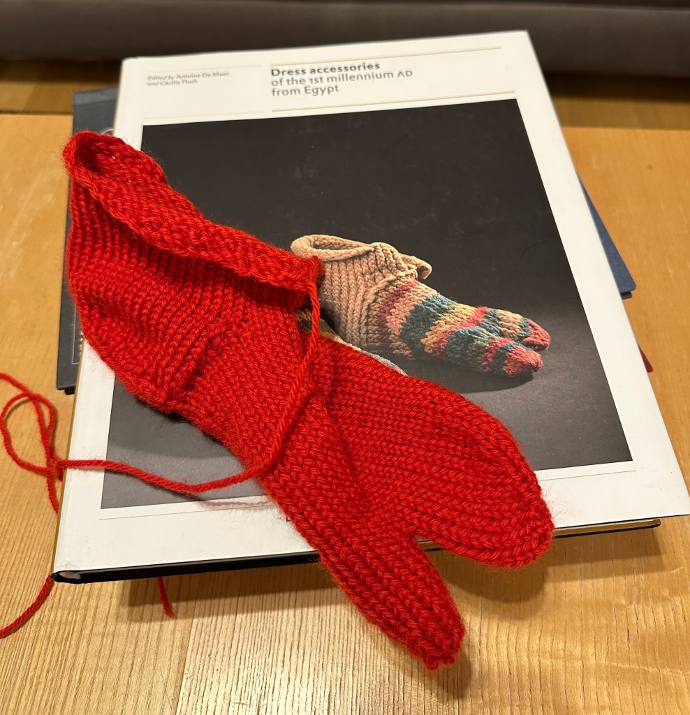 In my previous post (here) I outlined how I arrived at a theory for the development of knitting from cross-knit looped nalbinding. In short, I noticed that the structure of cross-knit looped nalbinding and crossed-stitch knitting are similar. The only difference was the direction of the loops (pointing down for nalbinding and up for knitting). Because of this, I hypothesized that nalbound fabric should behave like knitted fabric if unraveled from the starting end rather than the working end – as might happen if a hole were to develop in one’s sock. So, I tested this by making a nalbound tube and then unpicking the starting edge to see how the fabric would behave. When pulling on the yarn from the starting edge, my nalbinding unraveled in the same way knitting unravels. Observing this quality, which is particular to cross-knit looped nalbinding, could have given the makers of the iconic split-toed crimson socks from Egypt (image below) the initial idea for knitting, or what I will call ‘proto-knitting.’