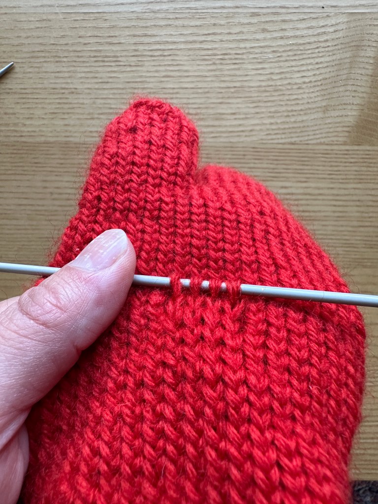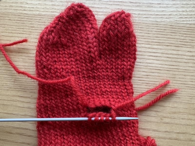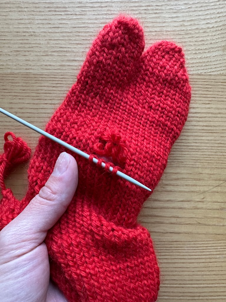 When sewing the hole closed, I found it easier to remove the loop from the needle right before the final pass of the nalbinding needle and yarn. This helped me see and understand the order of the crossings through the loop on the knitting needle; however, I suspect that with more experience I could make the final crossing with the loop still on the knitting needle.