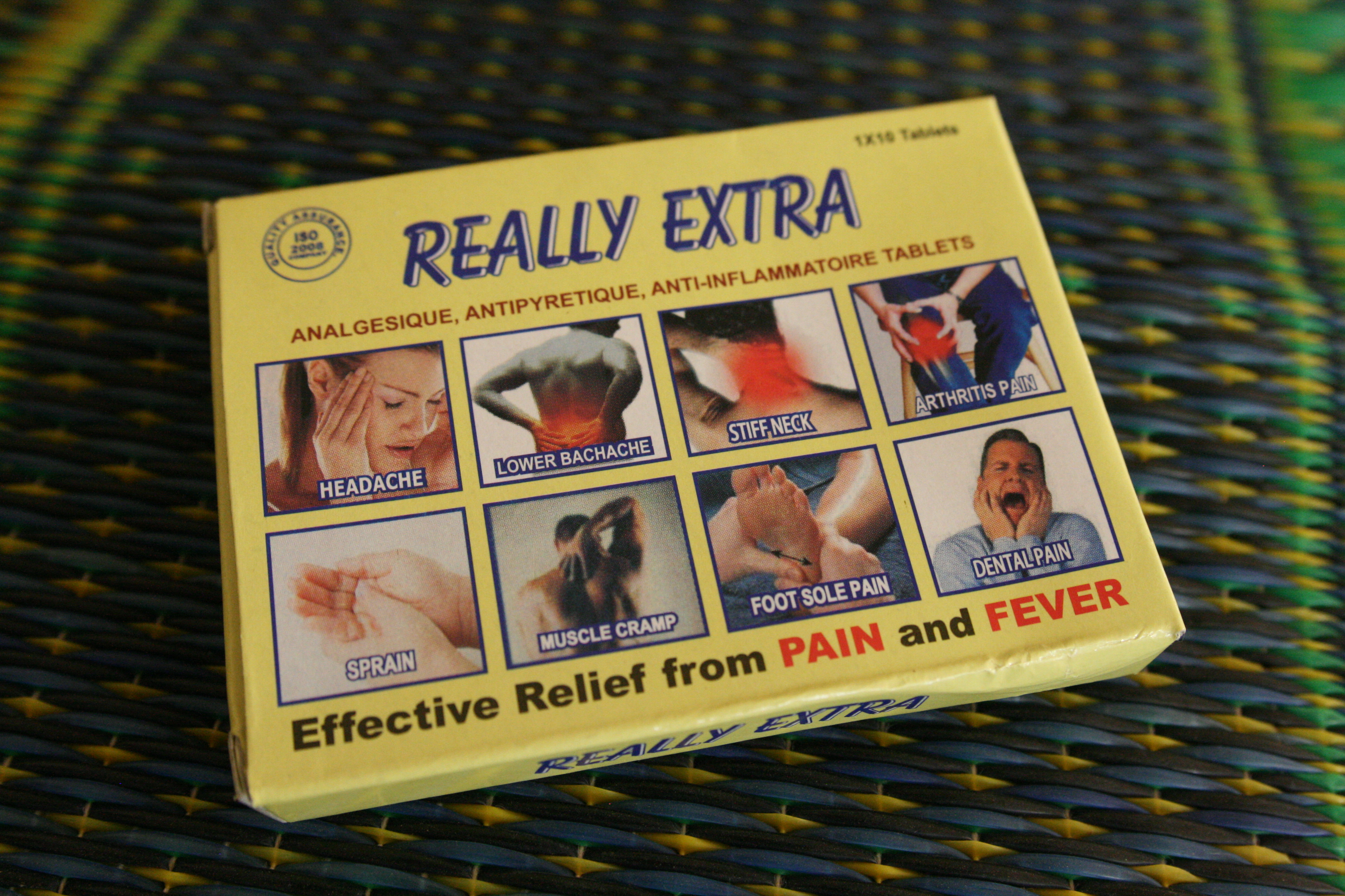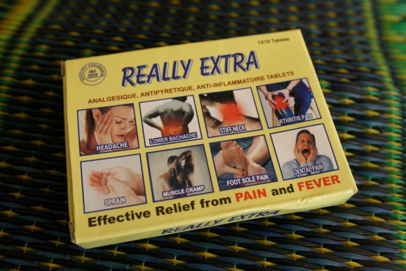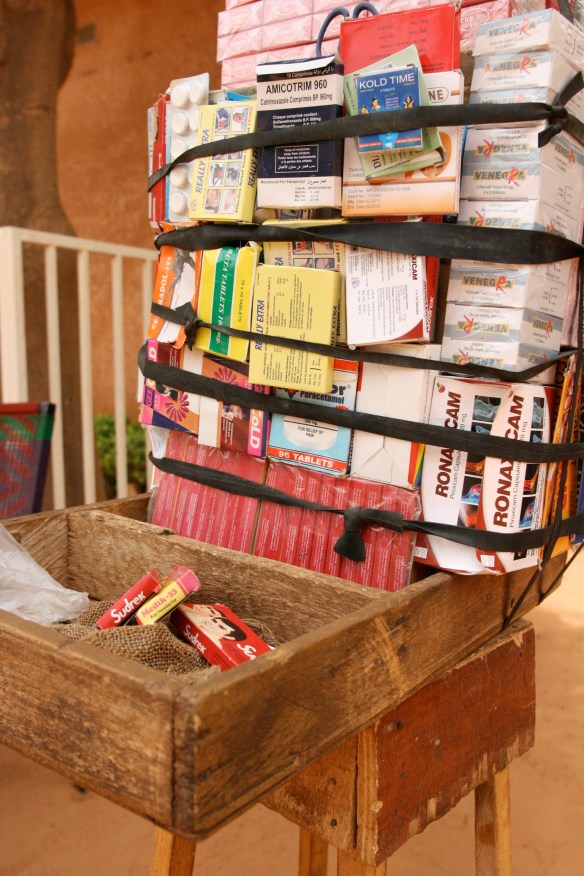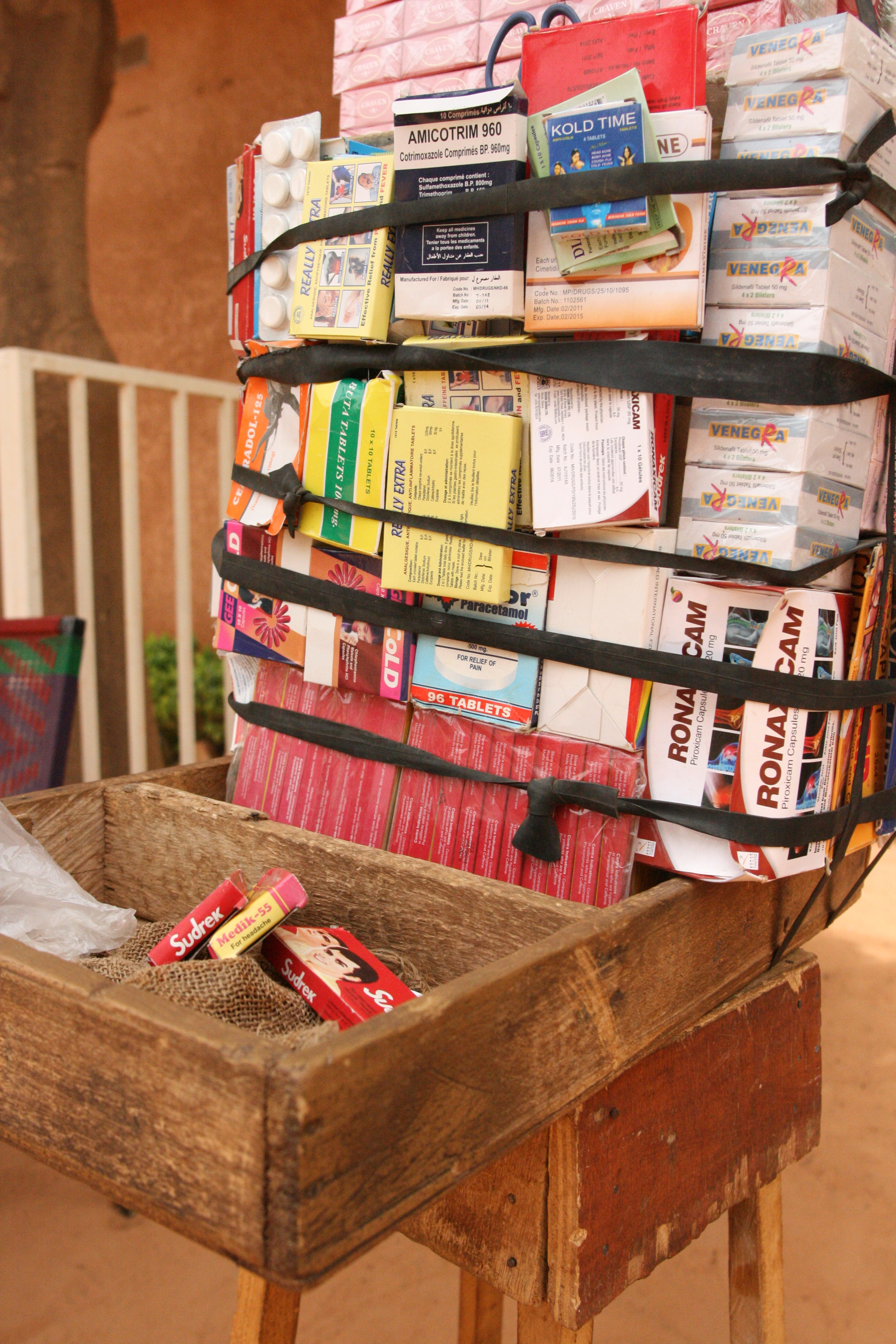 Pharmacy on foot. The vendor balances the box on his head and carries the stand over his shoulder as he walks down the road.Pain relief medicine from India. Customers can buy it by the pill for 50 CFA each or the entire package for 500 CFA.